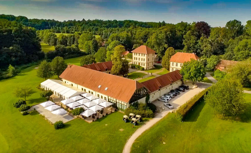 Am Herrenhaus wird es einen Sektempfang geben und es werden offizielle Hochzeitsfotos gemacht. Geht dafür zum grünen Punkt auf dem Satellitenbild.