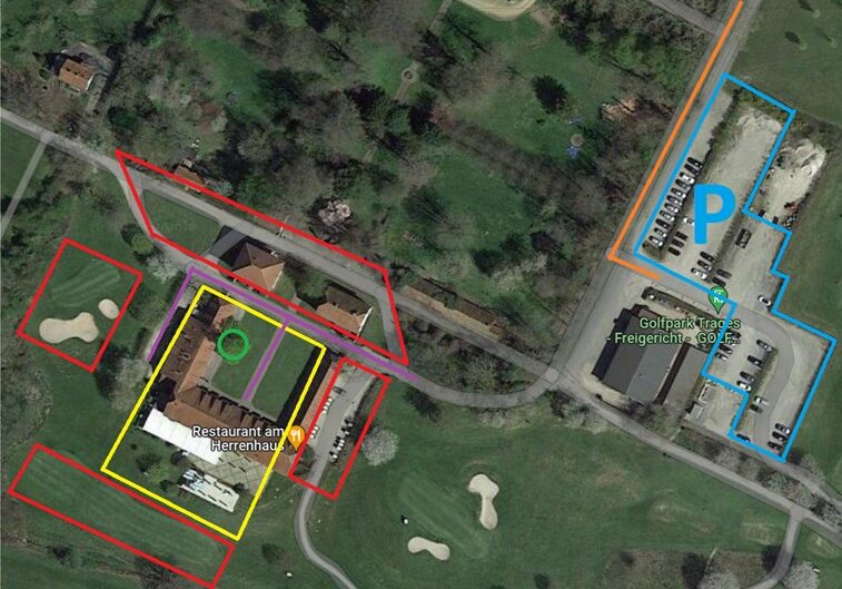 Aufenthalt vor Ort: Bitte beachtet, dass die Rot gekennzeichneten Flächen auf dem Satellitenbild nicht zum Restaurant gehören und wir uns demnach dort und auf dem Golfplatz NICHT aufhalten dürfen. Danke!